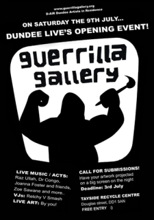 This exhibition is very cool and will be similar to the last Guerrilla Gallery, where the artwork was projected onto a wall inside the Tayside Recyclers building. I may take my camera along with me and take some photographs.