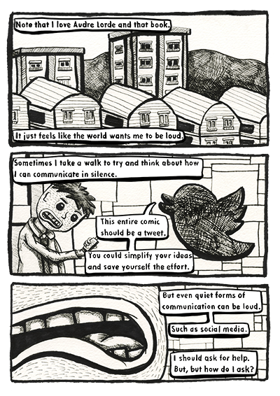 The story follows the creator of the comic as they discover what it means to be successful and if their own actions and mental health ruin their enjoyment of finding success. The idea of community and networking is explored in a visually exciting and experimental way. Some of the pages are ripped and destroyed. This presents the theme of self sabotage in an interesting and original method.