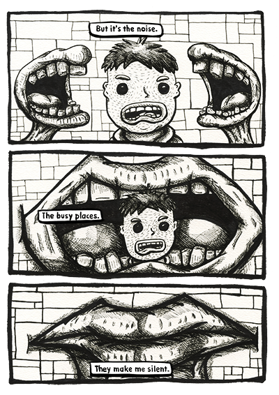 Awkward Silence is a personal comic book that looks at quietness and solitude in a loud world. The story follows the creator as they look at how loudness and quietness has affected them and changed how they communicate with other people and their environment. Being mute and not being able to speak has many implications and these are delicately presented in this intimate and experimental comic book memoir.