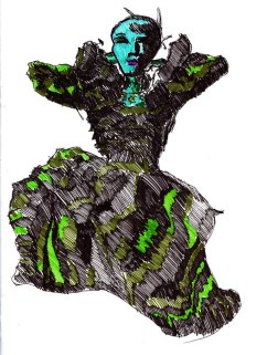With these images I’m looking at costume design and character. Using pencil and fine liners to get different results I am trying to express the different emotions that the costumes can present. I am also taking influences from the photography of Helmut Newton and the fashion designs of Thierry Mugler.