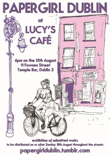 The Papergirl Dublin Exhibition will be on 15th August 2013 at Lucy’s Café (upstairs in Lucy’s Lounge), 11 Fownes Street, Temple Bar, Dublin 2.