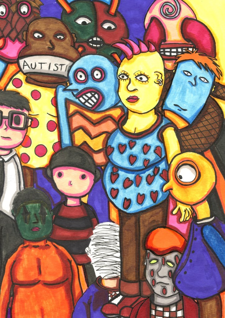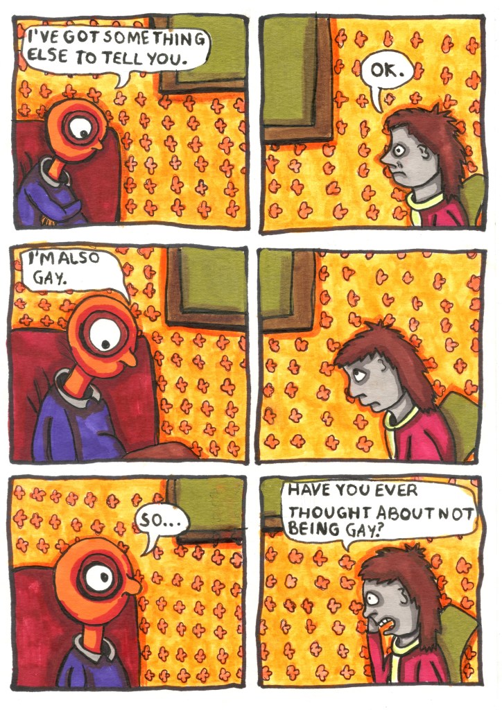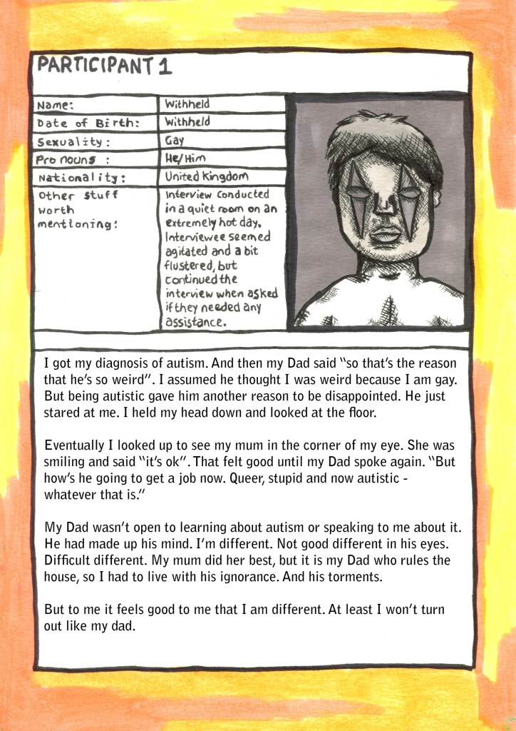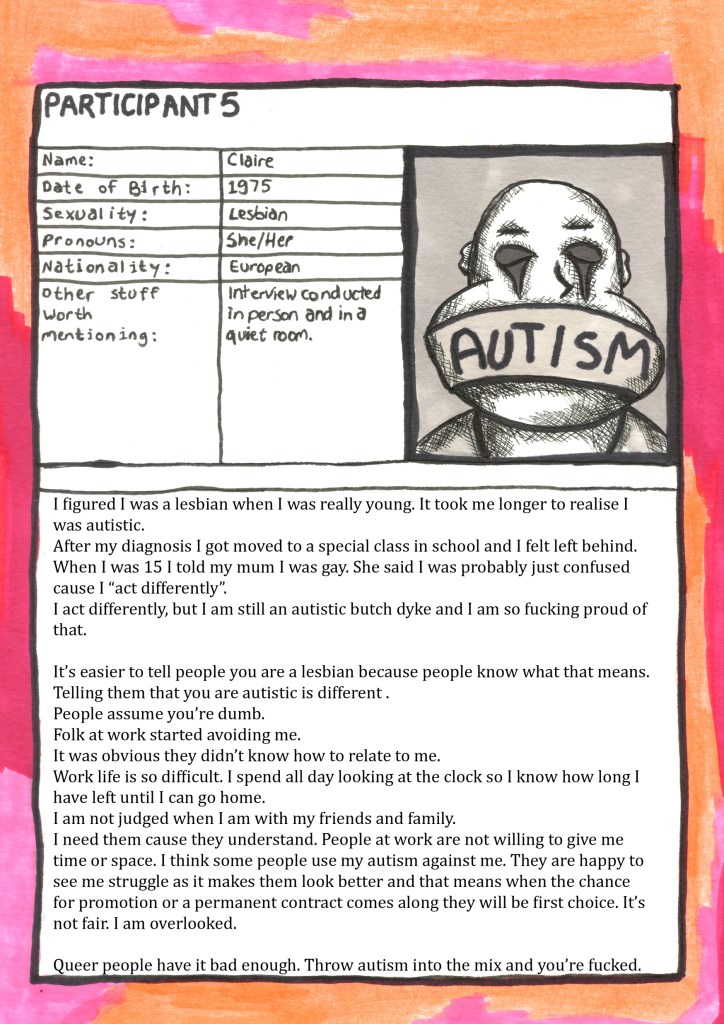 Coming Out Autistic is a queer comic book zine that features interviews with a variety of LGBTQ+ people. Each person is autistic and this comic tells their coming out stories. The stories are not how they come out as queer, but how they come out as autistic. Parallels with common ‘coming out as gay’ stories are drawn and differences are also highlighted. The zine includes interviews, illustrations and comic book pages.