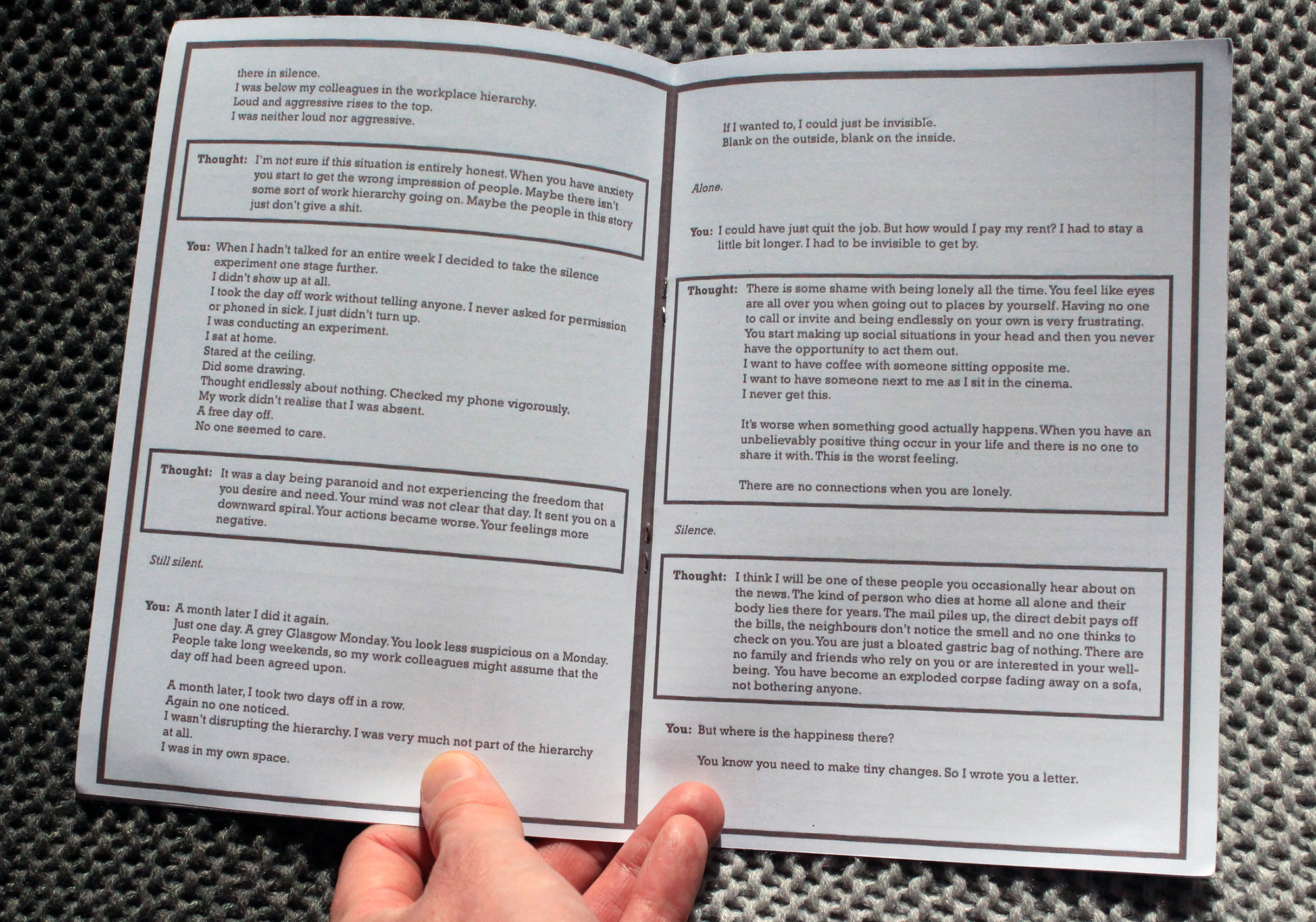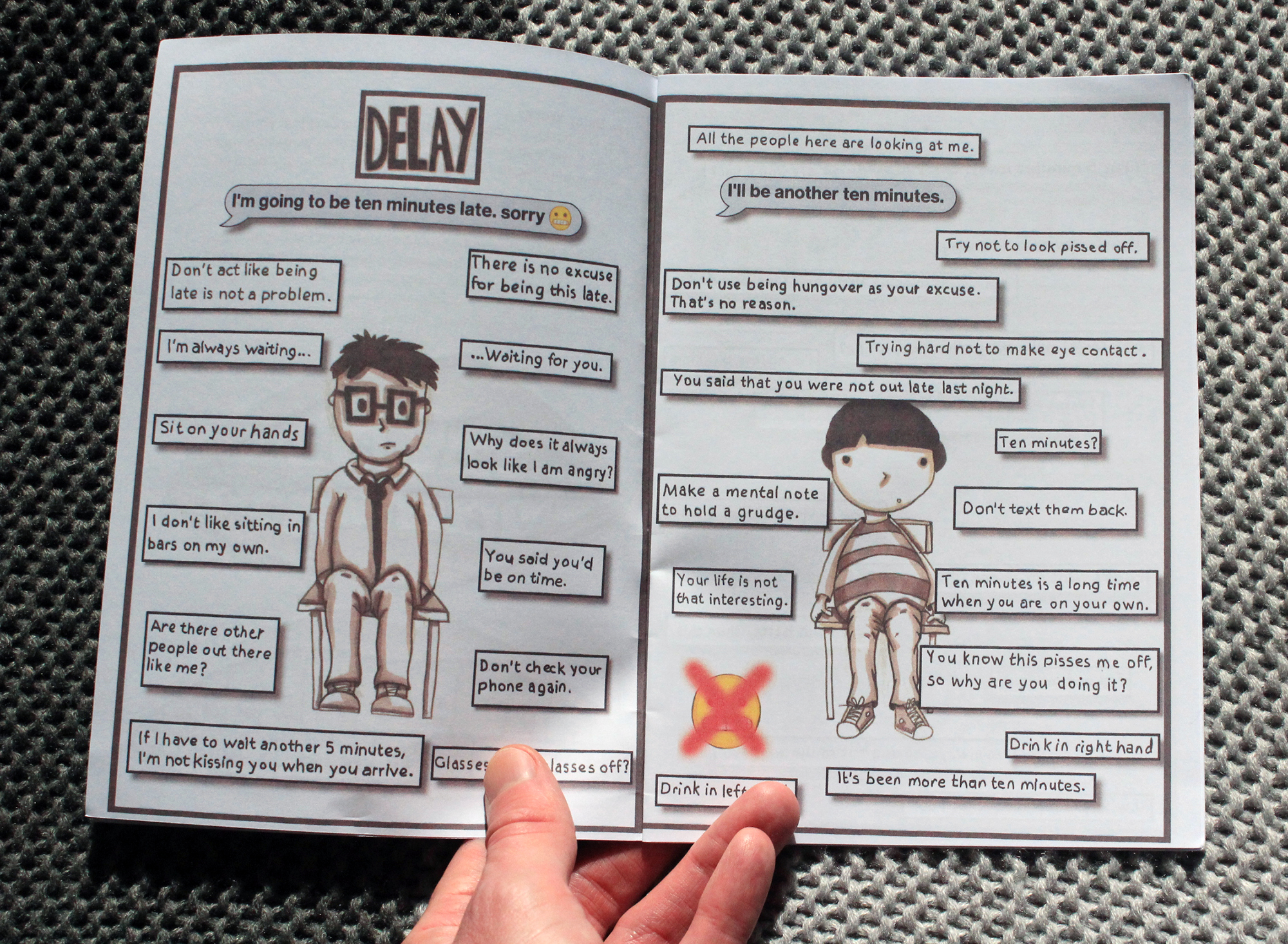 Delay is a queer love story told in a performance script and presented in an illustrated zine. It is a story about autism and queerness and is a personal and intimate account.