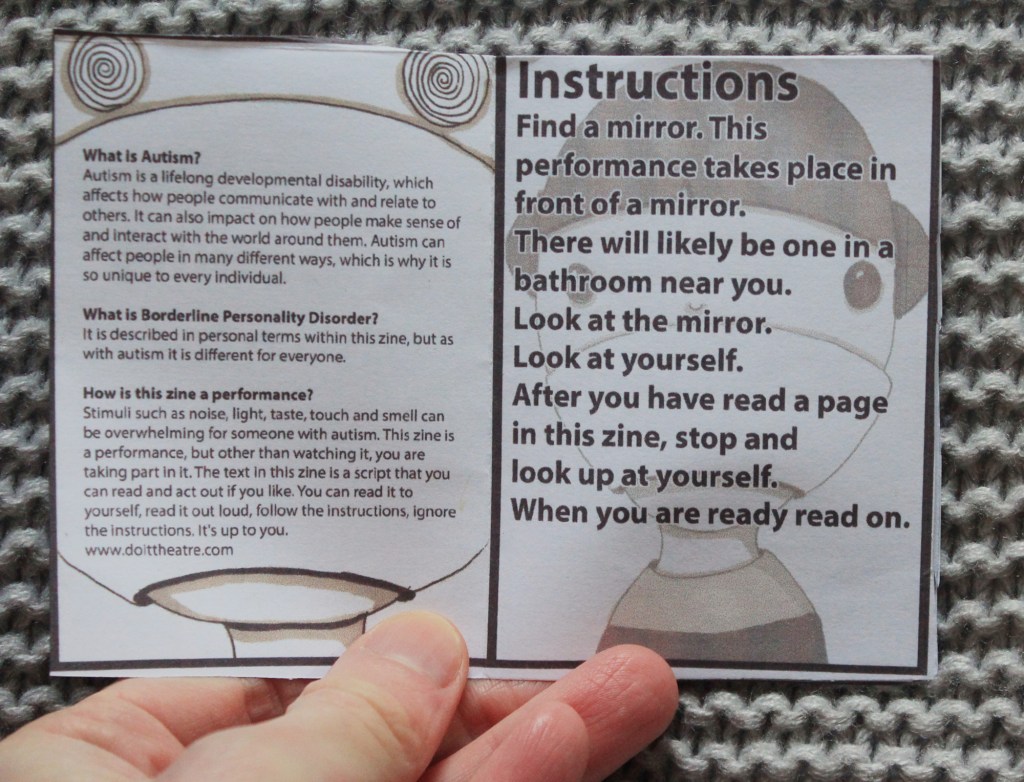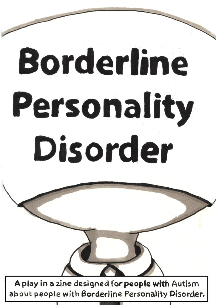 Borderline Personality Disorder is a 8 page mini-zine that contains a performance that is designed for autistic adults, but can be enjoyed by anyone. The zine contains a theatre script, illustrations and a comic. You read the theatre script to yourself and the illustrations and the comic spark the imagination. The play unfolds in your mind and creates a new and interesting type of performance that removes some of the stimuli that someone who lives with autism may find uncomfortable.