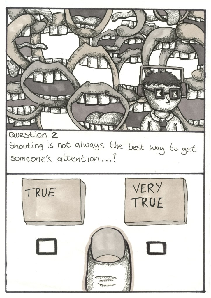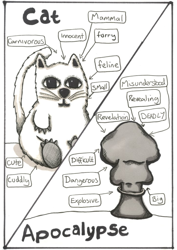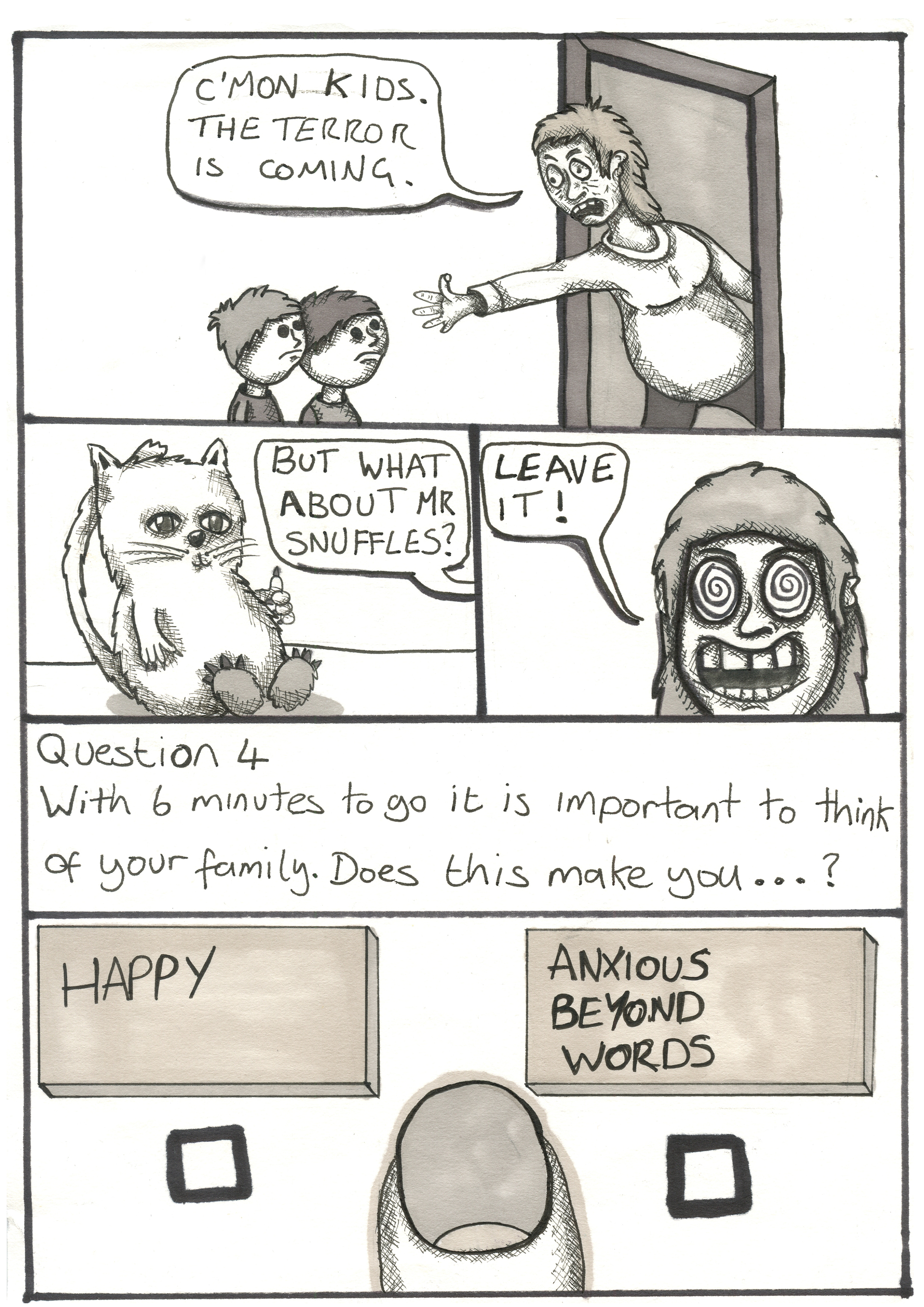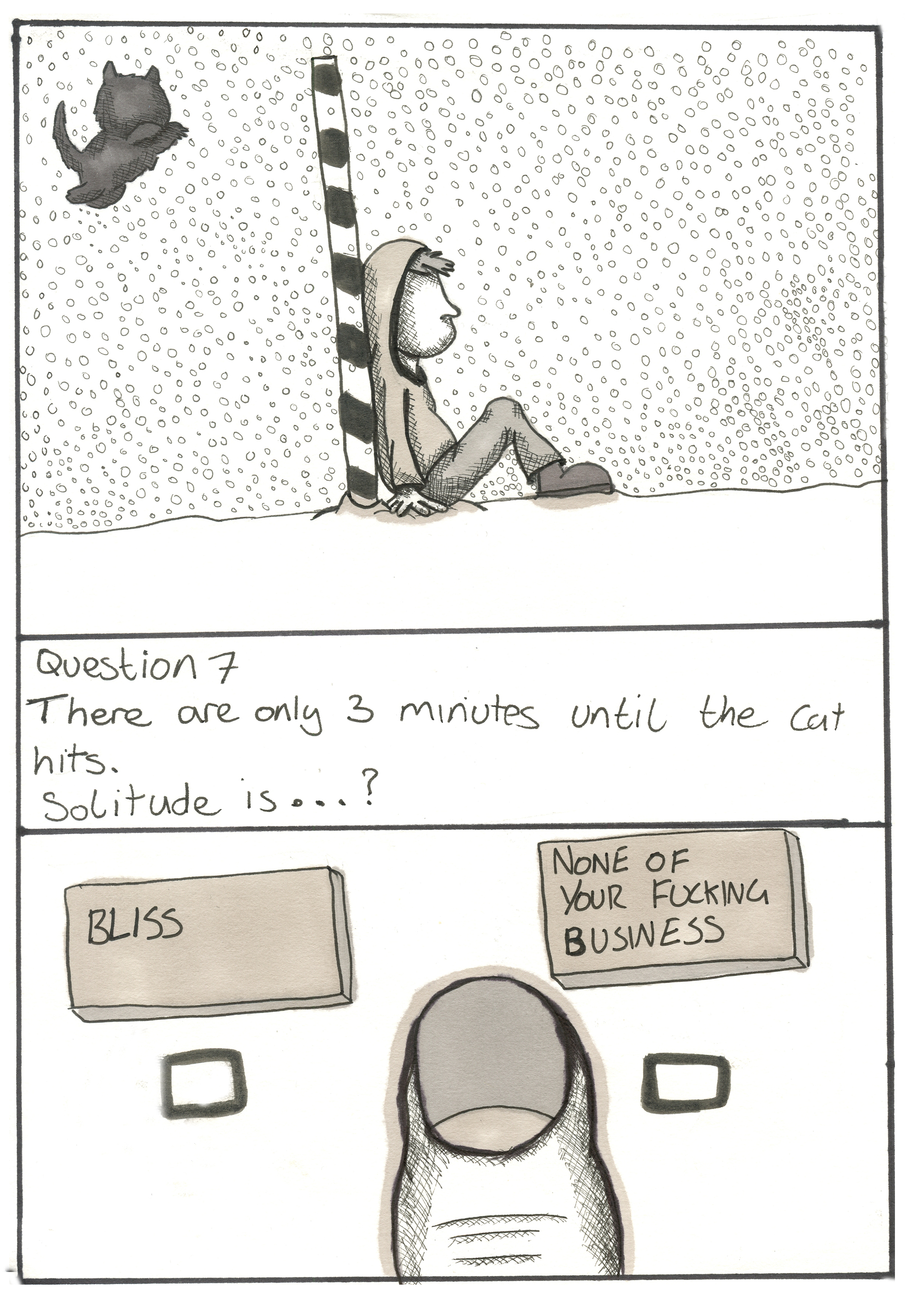 NeuroQueer Cat Apocalypse is a comic with a difference. You are asked 10 questions throughout the zine. You need to answer the questions from an autistic and queer perspective in order to survive. Answer correctly the planet is saved. Answer incorrectly and we all die.